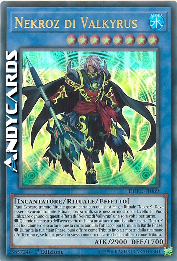 Puoi Evocare tramite Rituale questa carta con qualsiasi Magia Rituale "Nekroz". Deve essere Evocato tramite Rituale, senza utilizzare nessun mostro di Livello 8. Puoi utilizzare ognuno di questi effetti di "Nekroz di Valkyrus" una sola volta per turno.