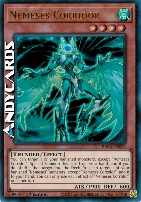 Puoi scegliere come bersaglio 1 dei tuoi mostri banditi, eccetto "Nemeses Corridoio"; Evoca Specialmente questa carta dalla tua mano e, se lo fai, mischia quel bersaglio nel Deck. Puoi scegliere come bersaglio 1 dei tuoi mostri "Nemeses" banditi, eccetto "Nemeses Corridoio"; aggiungilo alla tua mano. Puoi utilizzare ogni effetto di "Nemeses Corridoio" una sola volta per turno.