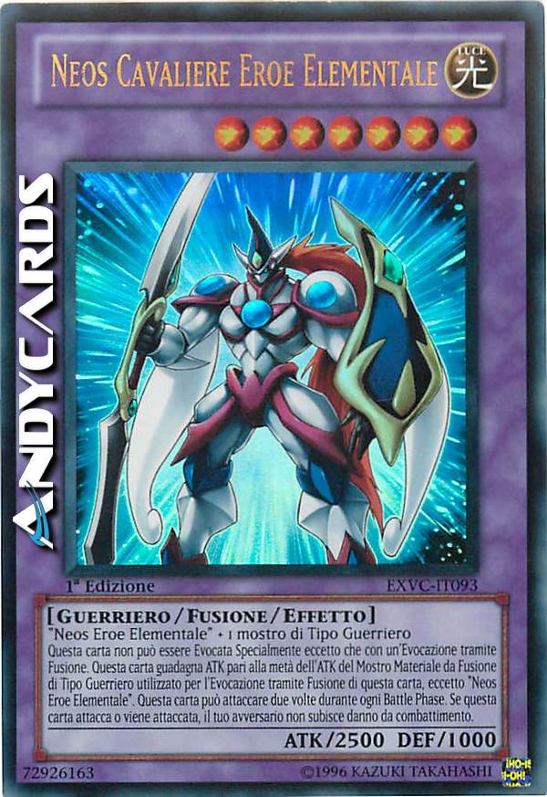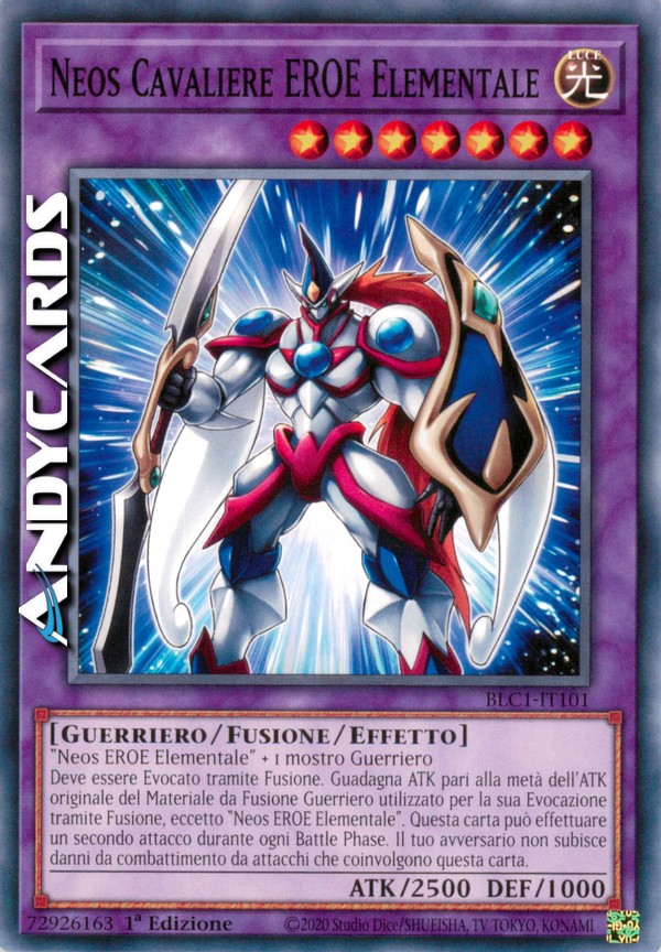 Deve essere Evocato tramite Fusione. Guadagna ATK pari alla metà dell'ATK originale del Materiale da Fusione Guerriero utilizzato per la sua Evocazione tramite Fusione, eccetto "Neos EROE Elementale". Questa carta può effettuare un secondo attacco durante ogni Battle Phase. Il tuo avversario non subisce danni da combattimento da attacchi che coinvolgono questa carta.
