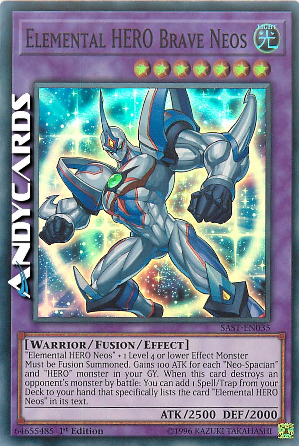 Deve essere Evocato tramite Fusione. Guadagna 100 ATK per ogni mostro "Neo-Spaziale" e "EROE" nel tuo Cimitero. Quando questa carta distrugge un mostro dell'avversario in battaglia: puoi aggiungere dal tuo Deck alla tua mano 1 Magia/Trappola che indica specificamente la carta "Neos EROE Elementale" nel suo testo.