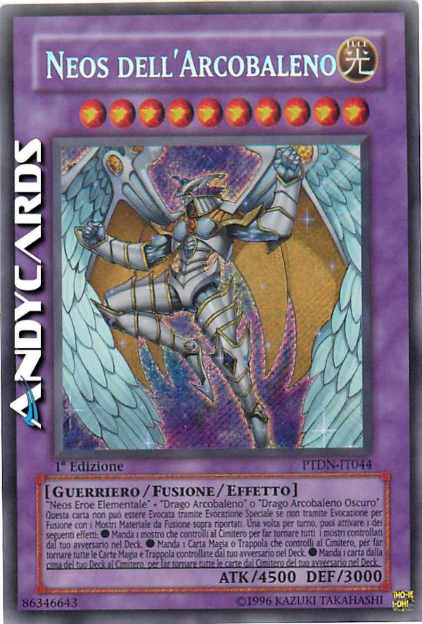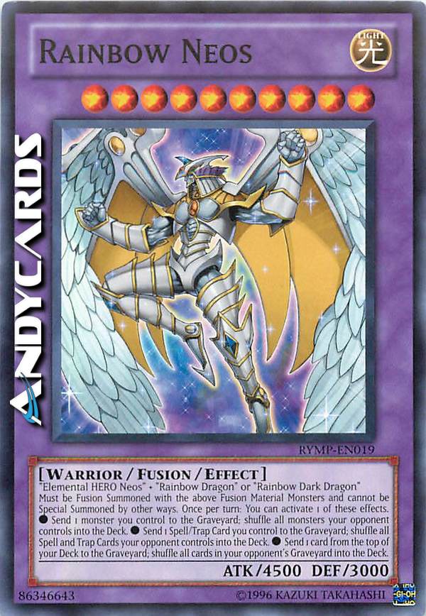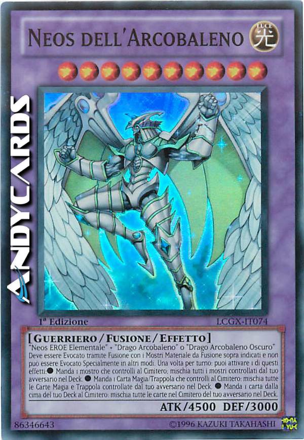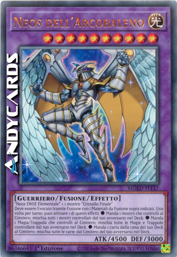 "Neos EROE Elementale" + "Drago Arcobaleno" o "Drago Arcobaleno Oscuro" Deve essere Evocato tramite Fusione con i Mostri Materiale da Fusione sopra indicati e non può essere Evocato Specialmente in altri modi. Una volta per turno: puoi attivare 1 di questi effetti. ?Manda 1 mostro che controlli al Cimitero; mischia tutti i mostri controllati dal tuo avversario nel Deck. ?Manda 1 Carta Magia/Trappola che controlli al Cimitero; mischia tutte le Carte Magia e Trappola controllate dal tuo avversario nel Deck. ?Manda 1 carta dalla cima del tuo Deck al Cimitero; mischia tutte le carte nel Cimitero del tuo avversario nel Deck.
