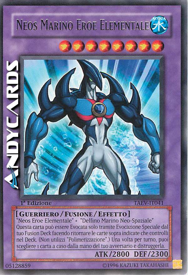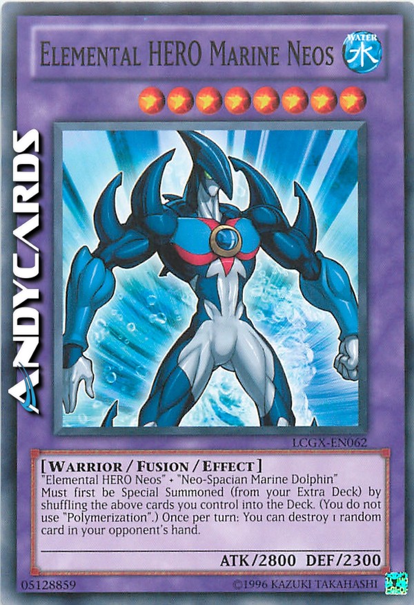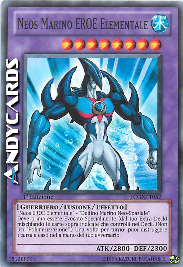 "Neos Eroe Elementale" + "Delfino Marino Neo-Spaziale". Questa carta può essere Evocata solo tramite Evocazione Speciale dal tuo Fusion Deck facendo ritornare le carte sopra citate che controlli nel Deck. (Non utilizzi "Polimerizzazione".) Una volta per turno, puoi scegliere 1 carta a caso dalla mano del tuo avversario e distruggerla.