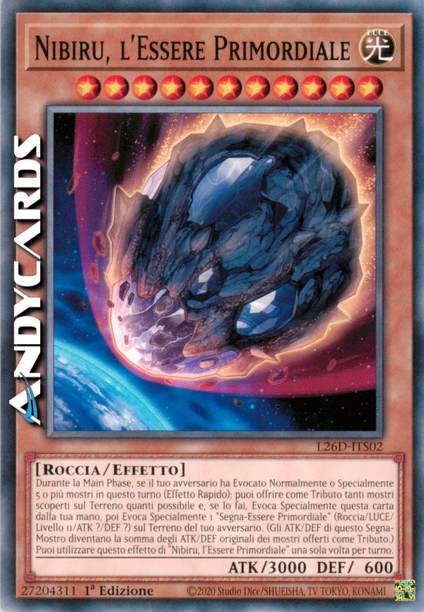 Durante la Main Phase, se il tuo avversario ha Evocato Normalmente o Specialmente 5 o più mostri in questo turno (Effetto Rapido): puoi offrire come Tributo tanti mostri scoperti sul Terreno quanti possibile e, se lo fai, Evoca Specialmente questa carta dalla tua mano, poi Evoca Specialmente 1 "Segna-Essere Primordiale" (Roccia/LUCE/Livello 11/ATK ?/DEF ?) sul Terreno del tuo avversario. (Gli ATK/DEF di questo Segna-Mostro diventano la somma degli ATK/DEF originali dei mostri offerti come Tributo.) Puoi utilizzare questo effetto di "Nibiru, l'Essere Primordiale" una sola volta per turno.