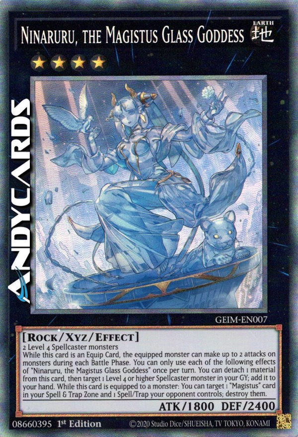 While this card is an Equip Card, the equipped monster can make up to 2 attacks on monsters during each Battle Phase. You can only use each of the following effects of "Ninaruru, the Magistus Glass Goddess" once per turn. You can detach 1 material from this card, then target 1 Level 4 or higher Spellcaster monster in your GY; add it to your hand. While this card is equipped to a monster: You can target 1 "Magistus" card in your Spell & Trap Zone and 1 Spell/Trap your opponent controls; destroy them.