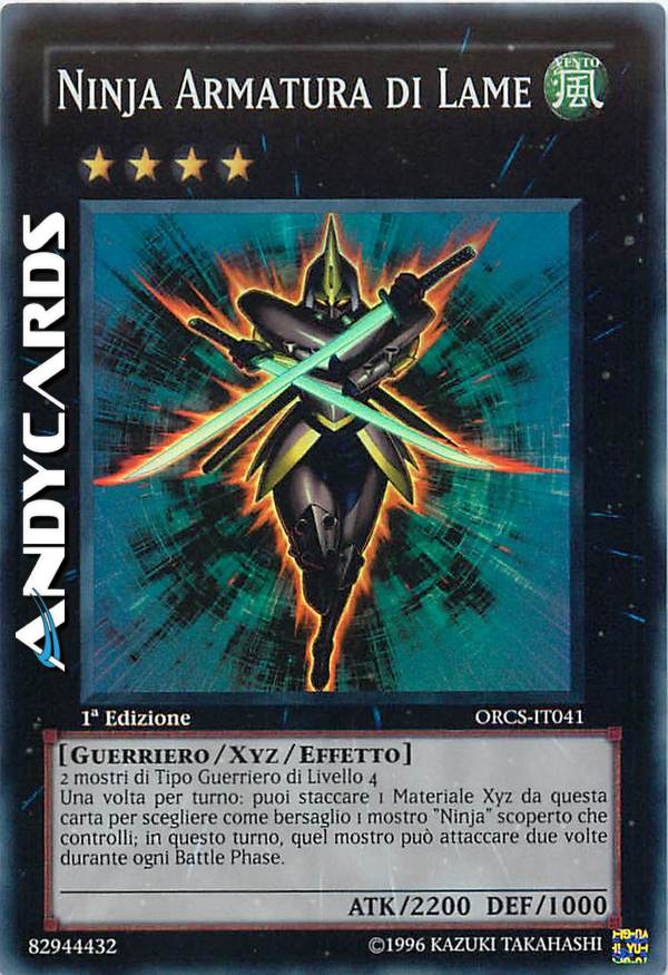 2 mostri di Tipo Guerriero di Livello 4 Una volta per turno: puoi staccare 1 Materiale Xyz da questa carta per scegliere come bersaglio 1 mostro "Ninja" che controlli; in questo turno, esso può effettuare un secondo attacco durante ogni Battle Phase.
