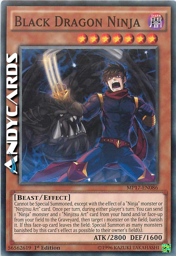 Non può essere Evocato Specialmente, eccetto con l'effetto di un mostro "Ninja" o di una carta "Arte Ninjutsu". Una volta per turno, durante il turno di qualsiasi giocatore: puoi mandare 1 mostro "Ninja" e 1 carta "Arte Ninjutsu" dalla tua mano e/o scoperta dal tuo Terreno al Cimitero, poi scegliere come bersaglio 1 mostro sul Terreno; bandiscilo. Se questa carta scoperta lascia il Terreno: Evoca Specialmente tanti mostri banditi dall'effetto di questa carta quanti possibile sul Terreno dei loro proprietari.
