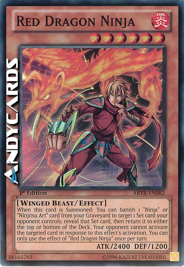 When this card is Summoned: You can banish 1 "Ninja" or "Ninjitsu Art" card from your Graveyard to target 1 Set card your opponent controls; reveal that Set card, then return it to either the top or bottom of the Deck. Your opponent cannot activate the targeted card in response to this effect's activation. You can only use the effect of "Red Dragon Ninja" once per turn.