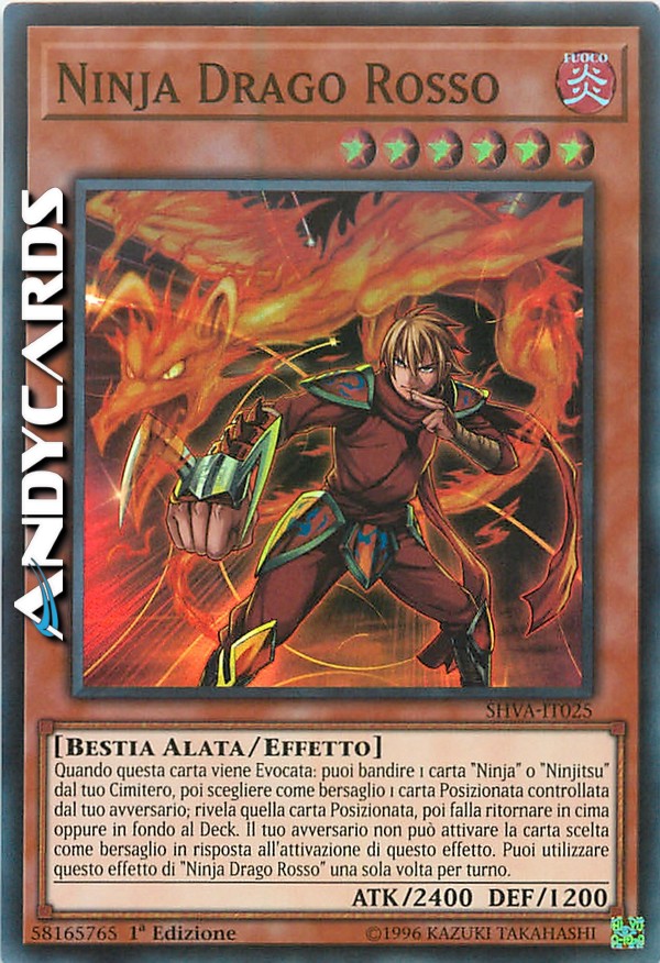 Quando questa carta viene Evocata: puoi bandire 1 carta "Ninja" o "Ninjitsu" dal tuo Cimitero, poi scegliere come bersaglio 1 carta Posizionata controllata dal tuo avversario; rivela quella carta Posizionata, poi falla ritornare in cima oppure in fondo al Deck. Il tuo avversario non può attivare la carta scelta come bersaglio in risposta all'attivazione di questo effetto. Puoi utilizzare questo effetto di "Ninja Drago Rosso" una sola volta per turno.