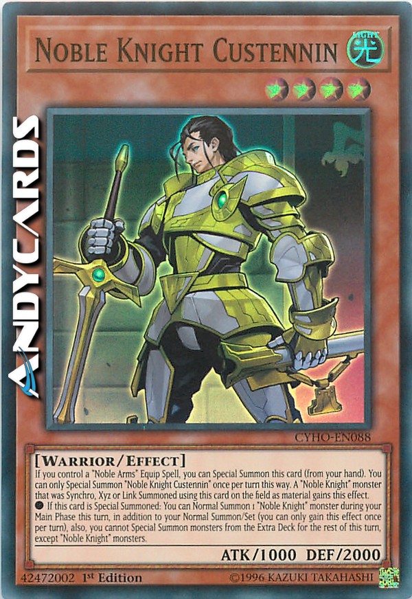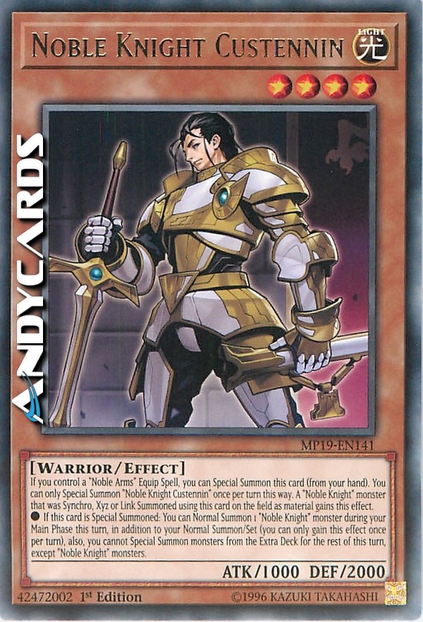 If you control a "Noble Arms" Equip Spell, you can Special Summon this card (from your hand). You can only Special Summon "Noble Knight Custennin" once per turn this way. A "Noble Knight" monster that was Synchro, Xyz or Link Summoned using this card on the field as material gains this effect.