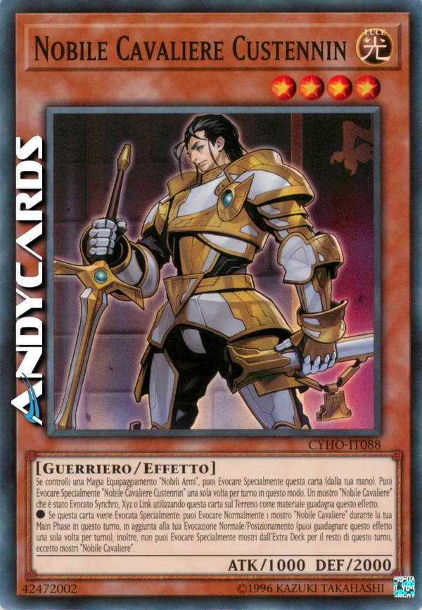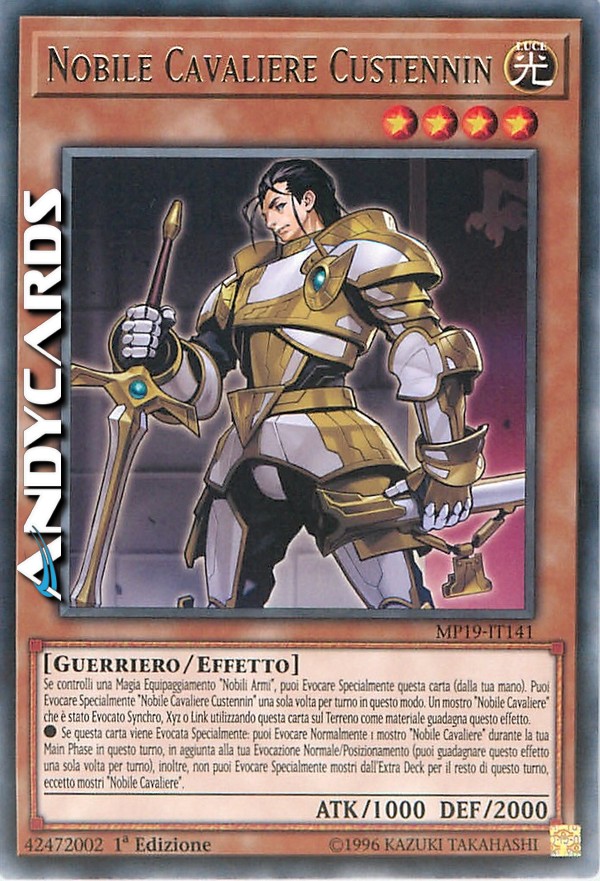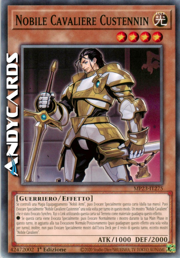 Se controlli una Magia Equipaggiamento "Nobili Armi", puoi Evocare Specialmente questa carta (dalla tua mano). Puoi Evocare Specialmente "Nobile Cavaliere Custennin" una sola volta per turno in questo modo. Un mostro "Nobile Cavaliere" che è stato Evocato Synchro, Xyz o Link utilizzando questa carta sul Terreno come materiale guadagna questo effetto.
