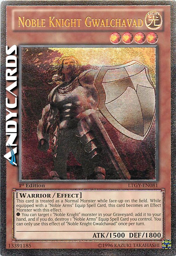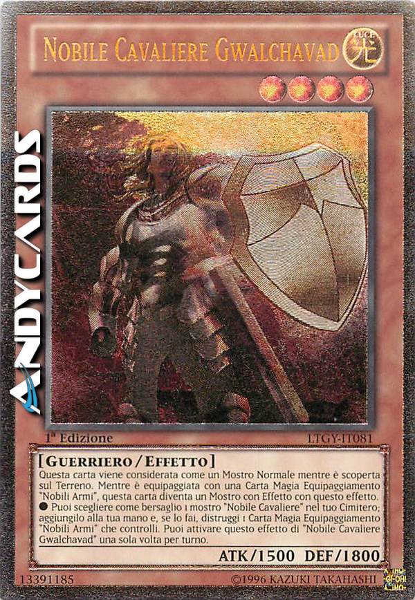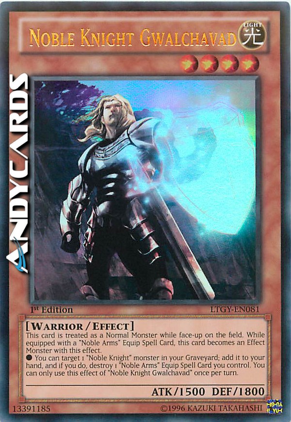 Questa carta viene considerata come un Mostro Normale mentre è scoperta sul Terreno. Mentre è equipaggiata con una Carta Magia Equipaggiamento "Nobili Armi", questa carta diventa un Mostro con Effetto con questo effetto. ?Puoi scegliere come bersaglio 1 mostro "Nobile Cavaliere" nel tuo Cimitero; aggiungilo alla tua mano e, se lo fai, distruggi 1 Carta Magia Equipaggiamento "Nobili Armi" che controlli. Puoi attivare questo effetto di "Nobile Cavaliere Gwalchavad" una sola volta per turno.