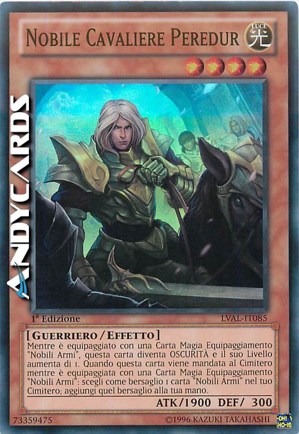 Mentre è equipaggiato con una Carta Magia Equipaggiamento "Nobili Armi", questa carta diventa OSCURITÀ e il suo Livello aumenta di 1. Quando questa carta viene mandata al Cimitero mentre è equipaggiata con una Carta Magia Equipaggiamento "Nobili Armi": scegli come bersaglio 1 carta "Nobili Armi" nel tuo Cimitero; aggiungi quel bersaglio alla tua mano.