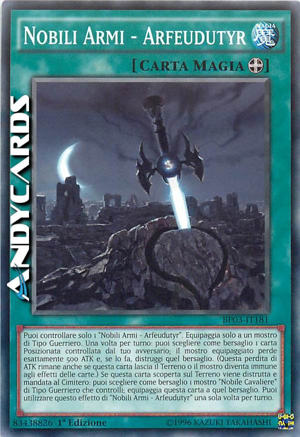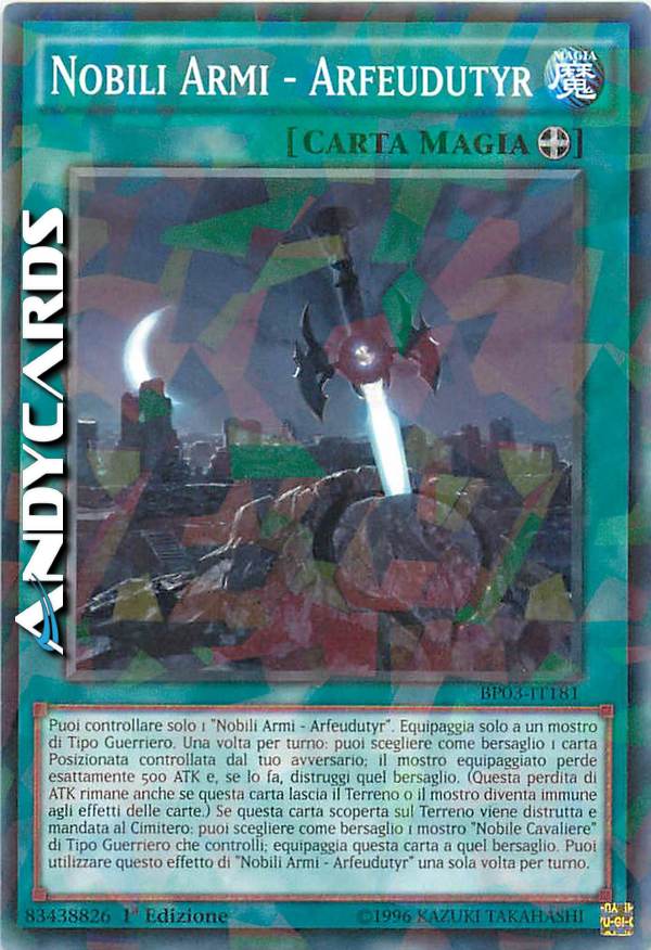 Puoi controllare solo 1 "Nobili Armi - Arfeudutyr" scoperto. Equipaggia solo a un mostro di Tipo Guerriero. Una volta per turno: puoi scegliere come bersaglio 1 carta Posizionata controllata dal tuo avversario; il mostro equipaggiato perde permanentemente 500 ATK e, se lo fa, distruggi quel bersaglio. (Questa perdita di ATK rimane anche se questa carta lascia il Terreno o il mostro diventa immune agli effetti delle carte.) Se questa carta scoperta sul Terreno viene distrutta e mandata al Cimitero: puoi scegliere come bersaglio 1 mostro "Nobile Cavaliere" di Tipo Guerriero scoperto che controlli; equipaggia questa carta a quel bersaglio. Puoi utilizzare questo effetto di "Nobili Armi - Arfeudutyr" una sola volta per turno.