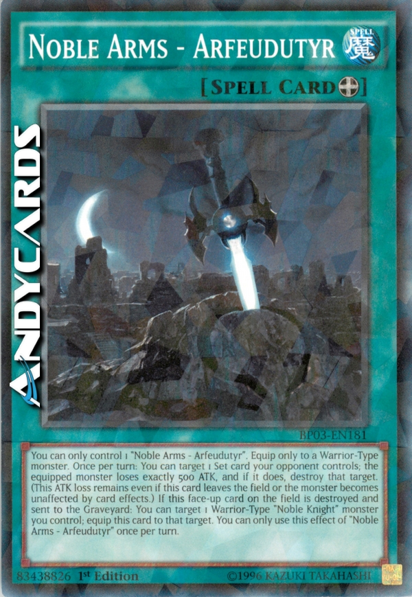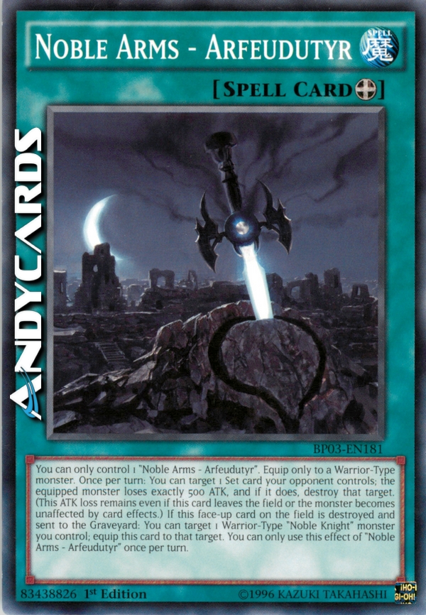 You can only control 1 face-up "Noble Arms - Arfeudutyr". Equip only to a Warrior-Type monster. Once per turn: You can target 1 Set card your opponent controls; the equipped monster permanently loses 500 ATK, and if it does, destroy that target. (The ATK loss remains even if this card leaves the field or the monster becomes unaffected by card effects.) If this face-up card on the field is destroyed and sent to the Graveyard: You can target 1 face-up Warrior-Type "Noble Knight" monster you control; equip this card to that target. You can only use this effect of "Noble Arms - Arfeudutyr" once per turn.