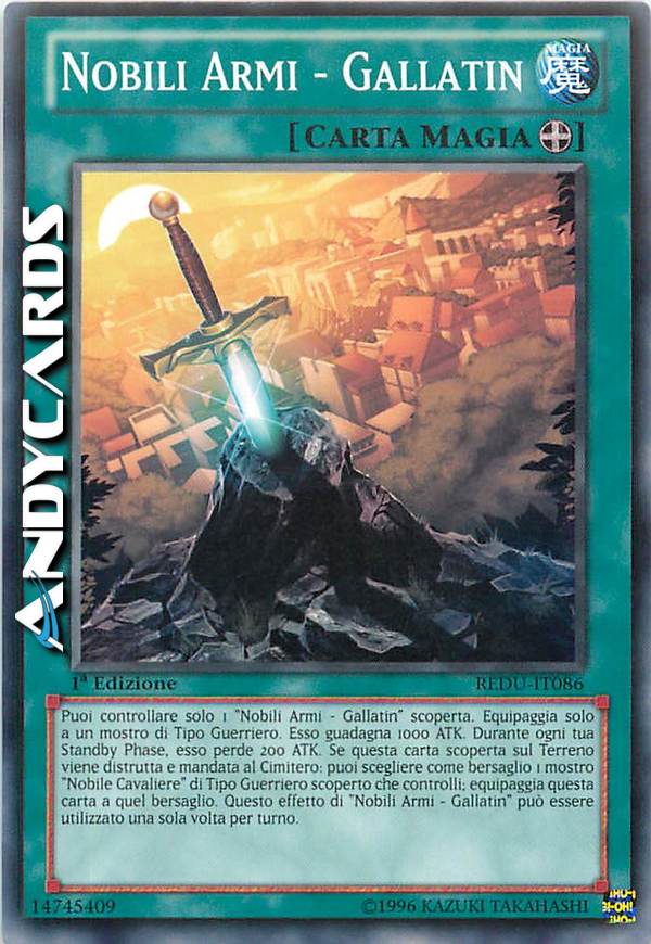 Puoi controllare solo 1 "Nobili Armi - Gallatin" scoperta. Equipaggia solo a un mostro di Tipo Guerriero. Esso guadagna 1000 ATK. Durante ogni tua Standby Phase, esso perde 200 ATK. Se questa carta scoperta sul Terreno viene distrutta e mandata al Cimitero: puoi scegliere come bersaglio 1 mostro "Nobile Cavaliere" di Tipo Guerriero scoperto che controlli; equipaggia questa carta a quel bersaglio. Questo effetto di "Nobili Armi - Gallatin" può essere utilizzato una sola volta per turno.