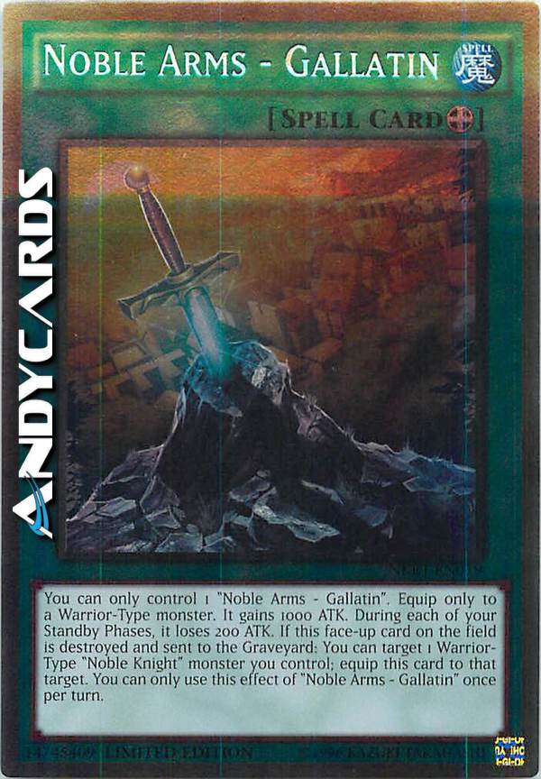 You can only control 1 face-up "Noble Arms - Gallatin". Equip only to a Warrior-Type monster. It gains 1000 ATK. During each of your Standby Phases, it loses 200 ATK. If this face-up card on the field is destroyed and sent to the Graveyard: You can target 1 face-up Warrior-Type "Noble Knight" monster you control; equip this card to that target. This effect of "Noble Arms - Gallatin" can only be used once per turn.