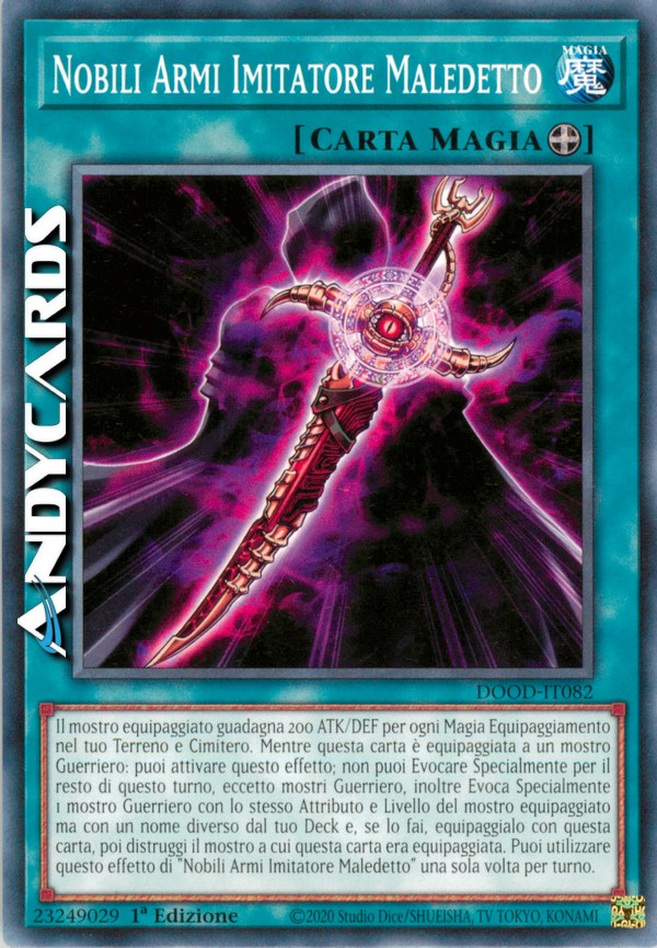 Il mostro equipaggiato guadagna 200 ATK/DEF per ogni Magia Equipaggiamento nel tuo Terreno e Cimitero. Mentre questa carta è equipaggiata a un mostro Guerriero: puoi attivare questo effetto; non puoi Evocare Specialmente per il resto di questo turno, eccetto mostri Guerriero, inoltre Evoca Specialmente 1 mostro Guerriero con lo stesso Attributo e Livello del mostro equipaggiato ma con un nome diverso dal tuo Deck e, se lo fai, equipaggialo con questa carta, poi distruggi il mostro a cui questa carta era equipaggiata. Puoi utilizzare questo effetto di "Nobili Armi Imitatore Maledetto" una sola volta per turno.