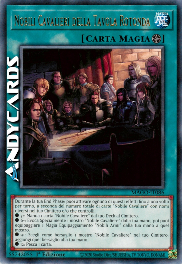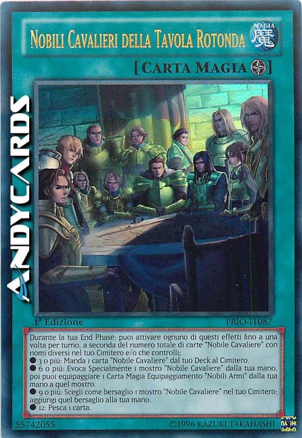 Durante la tua End Phase: puoi attivare ognuno di questi effetti fino a una volta per turno, a seconda del numero totale di carte "Nobile Cavaliere" con nomi diversi nel tuo Cimitero e/o che controlli; • 3 o più: Manda 1 carta "Nobile Cavaliere" dal tuo Deckal Cimitero • 6 o più: Evoca Specialmente 1 mostro "Nobile Cavaliere" dalla tua mano, poi puoi equipaggiare 1 Carta Magia Equipaggiamento "Nobili Armi" dalla tua mano a quel mostro. • 9 o più: Scegli come bersaglio 1 mostro "Nobile Cavaliere" nel tuo Cimitero; aggiungi quel bersaglio alla tua mano. • 12: pesca una carta.