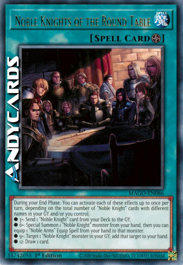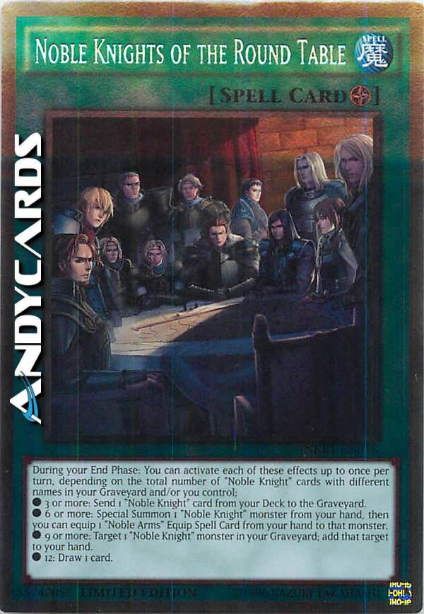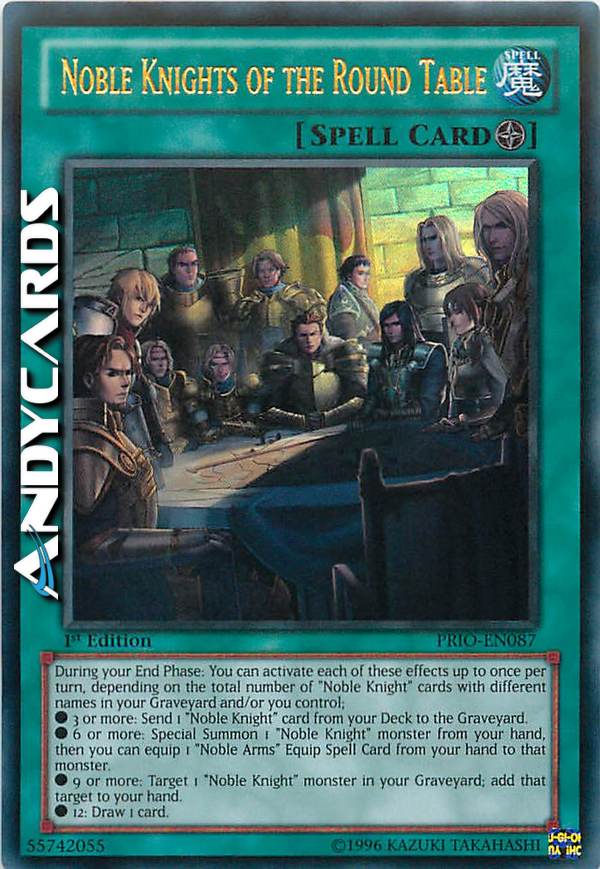During your End Phase: You can activate each of these effects up to once per turn, depending on the total number of "Noble Knight" cards with different names in your Graveyard and/or you control. • 3 or more: Send 1 "Noble Knight" card from your Deck to the Graveyard. • 6 or more: Special Summon 1 "Noble Knight" monster from your hand, then you can equip 1 "Noble Arms" Equip Spell Card from your hand to that monster. • 9 or more: Target 1 "Noble Knight" monster in your Graveyard; add that target to your hand. • 12: Draw 1 card.