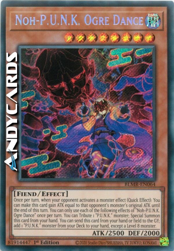 Once per turn, when your opponent activates a monster effect (Quick Effect): You can make this card gain ATK equal to that opponent's monster's original ATK until the end of this turn. You can only use each of the following effects of "Noh-P.U.N.K. Ogre Dance" once per turn. You can Tribute 1 "P.U.N.K." monster; Special Summon this card from your hand. You can send this card from your hand or field to the GY; add 1 "P.U.N.K." monster from your Deck to your hand, except a Level 8 monster.