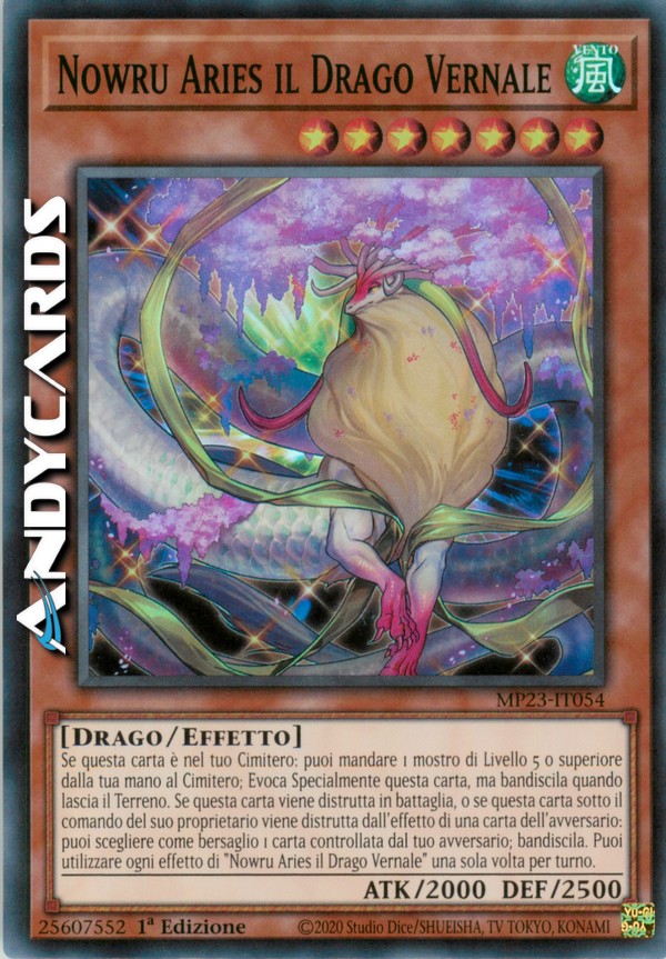 Se questa carta è nel tuo Cimitero: puoi mandare 1 mostro di Livello 5 o superiore dalla tua mano al Cimitero; Evoca Specialmente questa carta, ma bandiscila quando lascia il Terreno. Se questa carta viene distrutta in battaglia, o se questa carta sotto il comando del suo proprietario viene distrutta dall'effetto di una carta dell'avversario: puoi scegliere come bersaglio 1 carta controllata dal tuo avversario; bandiscila. Puoi utilizzare ogni effetto di "Nowru Aries il Drago Vernale" una sola volta per turno.