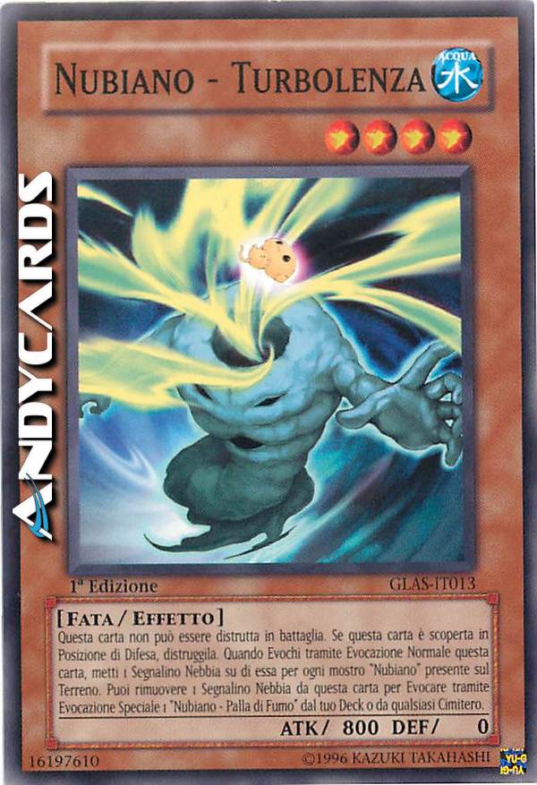 Questa carta non può essere distrutta in battaglia. Se questa carta è scoperta in Posizione di Difesa, distruggila. Quando Evochi tramite Evocazione Normale questa carta, metti 1 Segnalino Nebbia su di essa per ogni mostro "Nubiano" presente sul Terreno. Puoi rimuovere 1 Segnalino Nebbia da questa carta per Evocare tramite Evocazione Speciale 1 "Nubiano - Palla di Fumo" dal tuo Deck o da qualsiasi Cimitero.