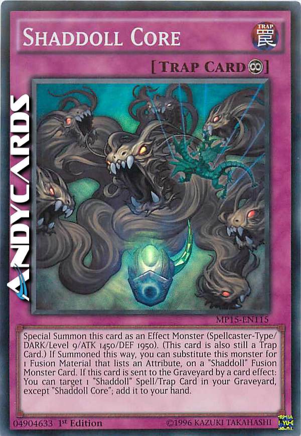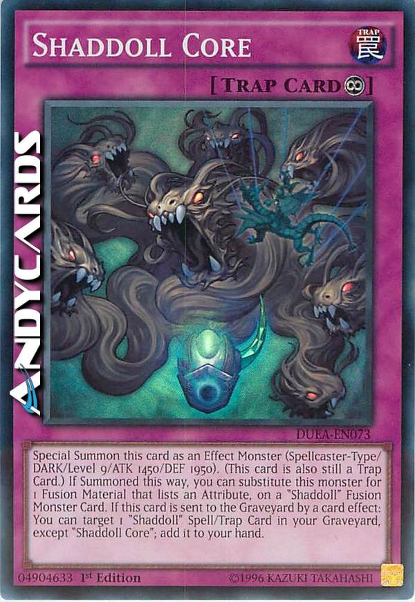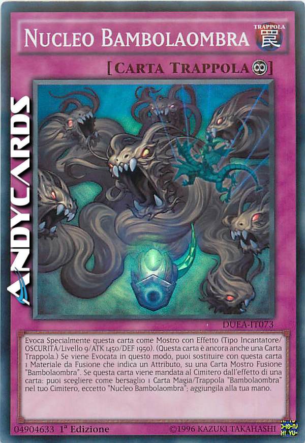 Evoca Specialmente questa carta come Mostro con Effetto (Tipo Incantatore/OSCURITÀ/Livello 9/ATK 1450/DEF 1950). (Questa carta è ancora anche una Carta Trappola.) Se viene Evocata in questo modo, puoi sostituire con questa carta 1 Materiale da Fusione che indica un Attributo, su una Carta Mostro Fusione "Bambolaombra". Se questa carta viene mandata al Cimitero dall'effetto di una carta: puoi scegliere come bersaglio 1 Carta Magia/Trappola "Bambolaombra" nel tuo Cimitero, eccetto "Nucleo Bambolaombra"; aggiungila alla tua mano.