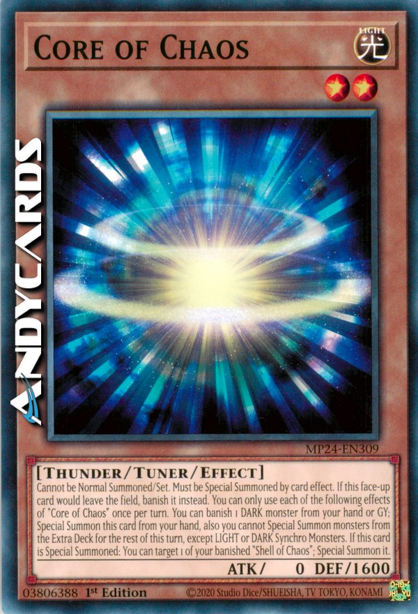 Non può essere Evocato Normalmente/Posizionato. Deve essere Evocato Specialmente dall'effetto di una carta. Se questa carta scoperta sta per lasciare il Terreno, invece bandiscila. Puoi utilizzare ognuno dei seguenti effetti di "Nucleo Chaos" una sola volta per turno. Puoi bandire 1 mostro OSCURITÀ dalla tua mano o Cimitero; Evoca Specialmente questa carta dalla tua mano, inoltre non puoi Evocare Specialmente mostri dall'Extra Deck per il resto di questo turno, eccetto Mostri Synchro LUCE o OSCURITÀ. Se questa carta viene Evocata Specialmente: puoi scegliere come bersaglio 1 dei tuoi "Guscio del Chaos" banditi; Evocalo Specialmente.