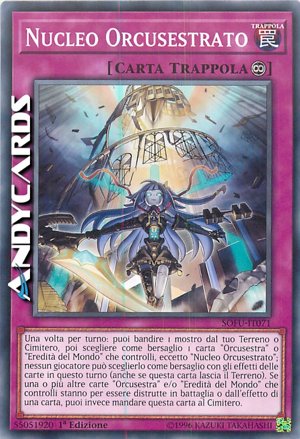 Una volta per turno: puoi bandire 1 mostro dal tuo Terreno o Cimitero, poi scegliere come bersaglio 1 carta "Orcusestra" o "Eredità del Mondo" che controlli, eccetto "Nucleo Orcusestrato"; nessun giocatore può sceglierlo come bersaglio con gli effetti delle carte in questo turno (anche se questa carta lascia il Terreno). Se una o più altre carte "Orcusestra" e/o "Eredità del Mondo" che controlli stanno per essere distrutte in battaglia o dall'effetto di una carta, puoi invece mandare questa carta al Cimitero.