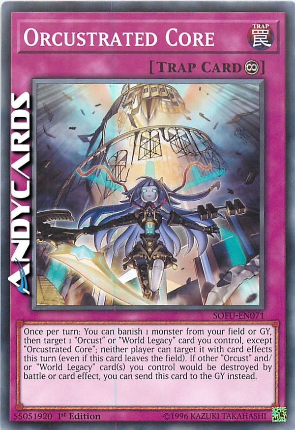 Once per turn: You can banish 1 monster from your field or GY, then target 1 "Orcust" or "World Legacy" card you control, except "Orcustrated Core"; neither player can target it with card effects this turn (even if this card leaves the field). If other "Orcust" and/or "World Legacy" card(s) you control would be destroyed by battle or card effect, you can send this card to the GY instead.