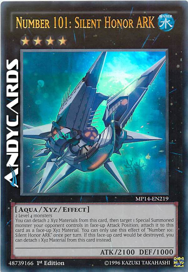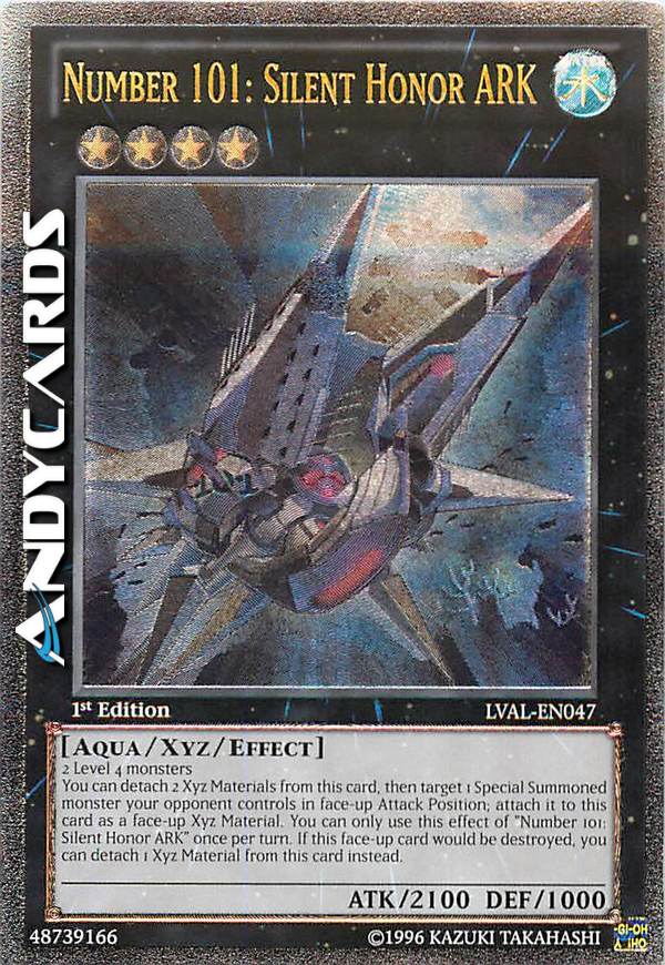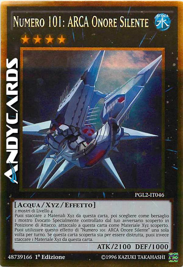Puoi staccare 2 materiali da questa carta, poi scegliere come bersaglio 1 mostro Evocato Specialmente controllato dal tuo avversario scoperto in Posizione di Attacco; attaccalo a questa carta come materiale. Puoi utilizzare questo effetto di "Numero 101: ARCA Onore Silente" una sola volta per turno. Se questa carta scoperta sul Terreno sta per essere distrutta in battaglia o dall'effetto di una carta, puoi invece staccare 1 materiale da questa carta.