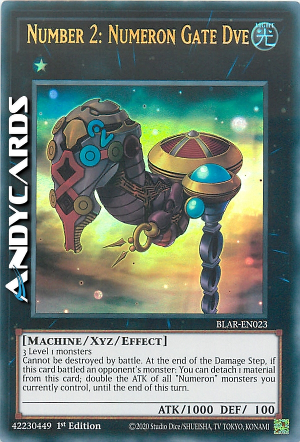 Non può essere distrutto in battaglia. Alla fine del Damage Step, se questa carta ha combattuto con un mostro dell'avversario: puoi staccare 1 materiale da questa carta; raddoppia l'ATK di tutti i mostri "Numeron" che controlli attualmente, fino alla fine di questo turno.