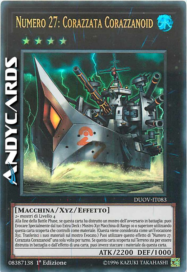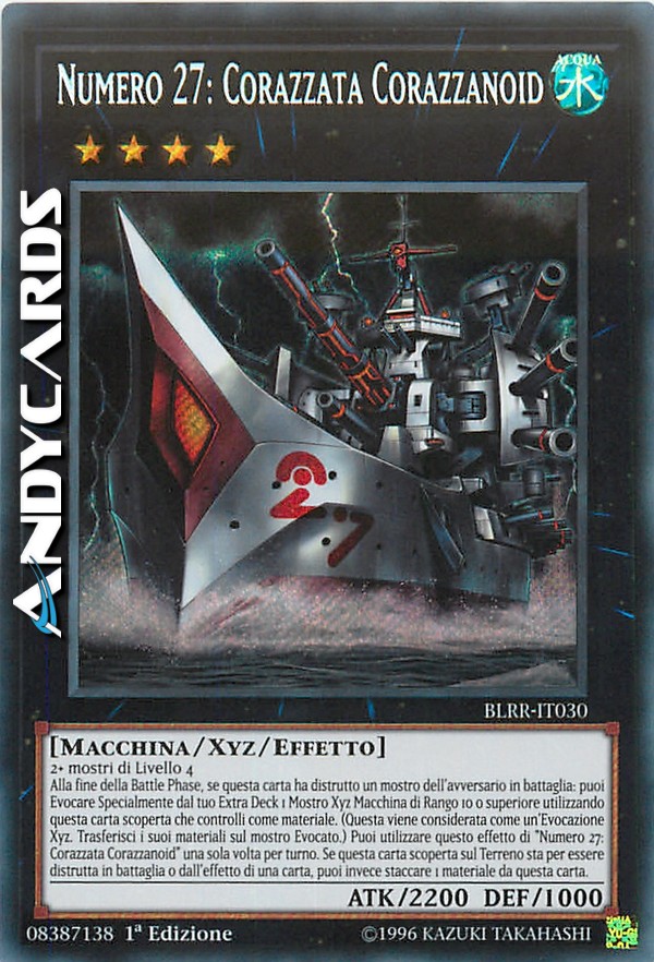 Alla fine della Battle Phase, se questa carta ha distrutto un mostro dell'avversario in battaglia: puoi Evocare Specialmente dal tuo Extra Deck 1 Mostro Xyz Macchina di Rango 10 o superiore utilizzando questa carta scoperta che controlli come materiale. (Questa viene considerata come un'Evocazione Xyz. Trasferisci i suoi materiali sul mostro Evocato.) Puoi utilizzare questo effetto di "Numero 27: Corazzata Corazzanoid" una sola volta per turno. Se questa carta scoperta sul Terreno sta per essere distrutta in battaglia o dall'effetto di una carta, puoi invece staccare 1 materiale da questa carta.