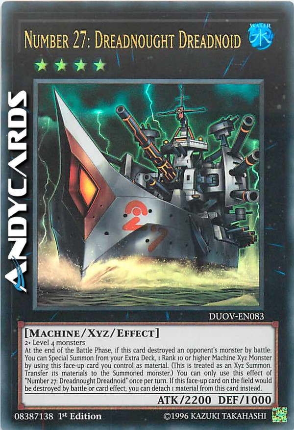 At the end of the Battle Phase, if this card destroyed an opponent's monster by battle: You can Special Summon from your Extra Deck, 1 Rank 10 or higher Machine Xyz Monster by using this face-up card you control as material. (This is treated as an Xyz Summon. Transfer its materials to the Summoned monster.) You can only use this effect of "Number 27: Dreadnought Dreadnoid" once per turn. If this face-up card on the field would be destroyed by battle or card effect, you can detach 1 material from this card instead.