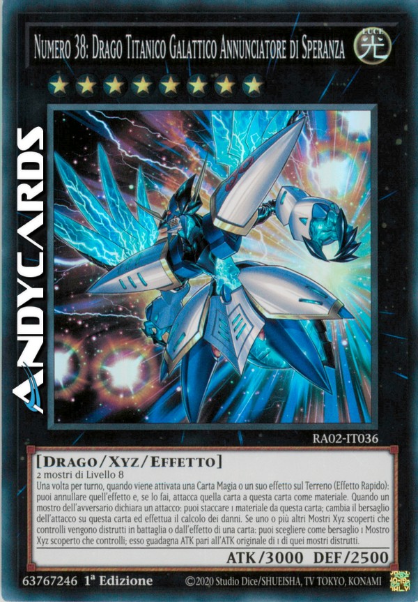 Una volta per turno, quando viene attivata una Carta Magia o un suo effetto sul Terreno (Effetto Rapido): puoi annullare quell'effetto e, se lo fai, attacca quella carta a questa carta come materiale. Quando un mostro dell'avversario dichiara un attacco: puoi staccare 1 materiale da questa carta; cambia il bersaglio dell'attacco su questa carta ed effettua il calcolo dei danni. Se uno o più altri Mostri Xyz scoperti che controlli vengono distrutti in battaglia o dall'effetto di una carta: puoi scegliere come bersaglio 1 Mostro Xyz scoperto che controlli; esso guadagna ATK pari all'ATK originale di 1 di quei mostri distrutti.