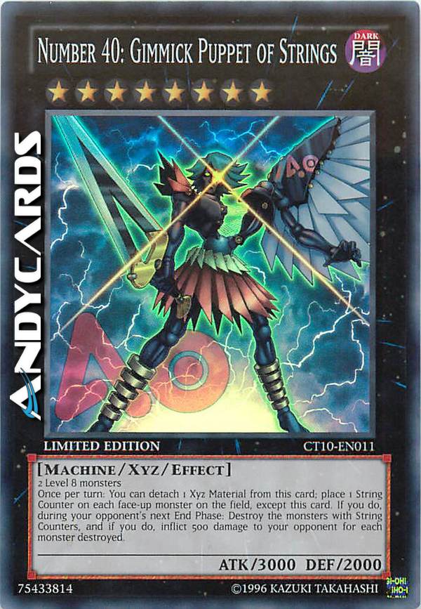 2 Level 8 monsters Once per turn: You can detach 1 Xyz Material from this card; place 1 String Counter on each face-up monster on the field, except this card. If you do, during your opponent's next End Phase: Destroy the monsters with String Counters, and if you do, inflict 500 damage to your opponent for each monster destroyed.