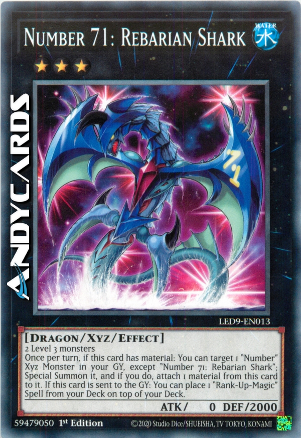 2 Level 3 monsters - Once per turn: You can target 1 "Number" Xyz Monster in your GY, except "Number 71: Rebarian Shark"; Special Summon it, and if you do, attach 1 material from this card to it. If this card is sent to the GY: You can choose 1 "Rank-Up-Magic" Spell from your Deck and place it on top of your Deck.