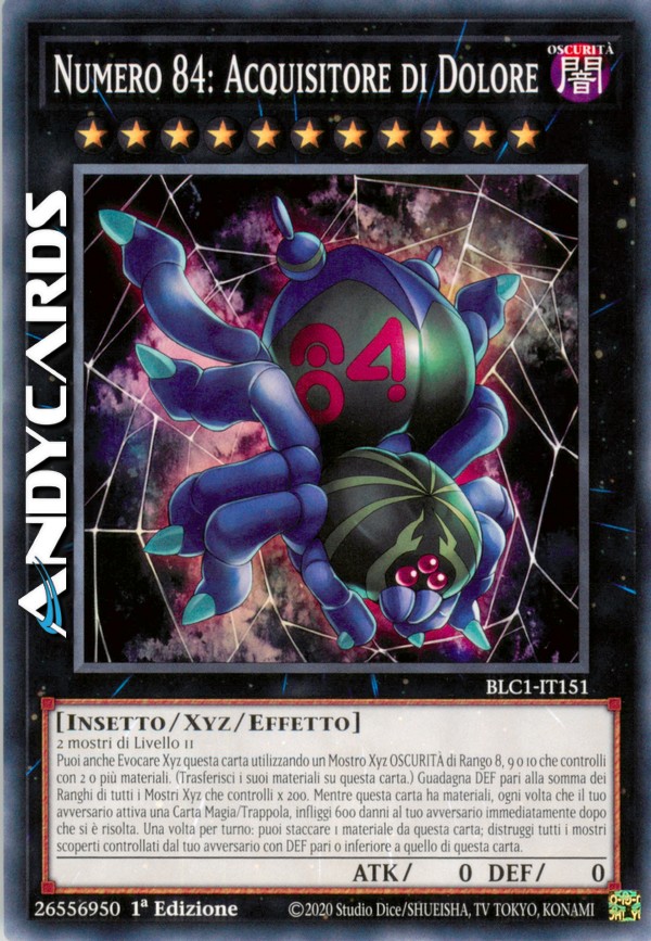 2 mostri di Livello 11 - Puoi anche Evocare Xyz questa carta utilizzando un Mostro Xyz OSCURITÀ di Rango 8, 9 o 10 che controlli con 2 o più Materiali Xyz come Materiale Xyz. (I Materiali Xyz attaccati a quel mostro diventano Materiali Xyz anche su questa carta.) Questa carta guadagna DEF pari alla somma dei Ranghi di tutti i Mostri Xyz che controlli x 200. Mentre questa carta ha Materiali Xyz, ogni volta che il tuo avversario attiva una Carta Magia/Trappola, infliggi 600 danni al tuo avversario immediatamente dopo che si è risolta. Una volta per turno: puoi staccare 1 Materiale Xyz da questa carta; distruggi tutti i mostri scoperti controllati dal tuo avversario con DEF pari o inferiore a quello di questa carta.