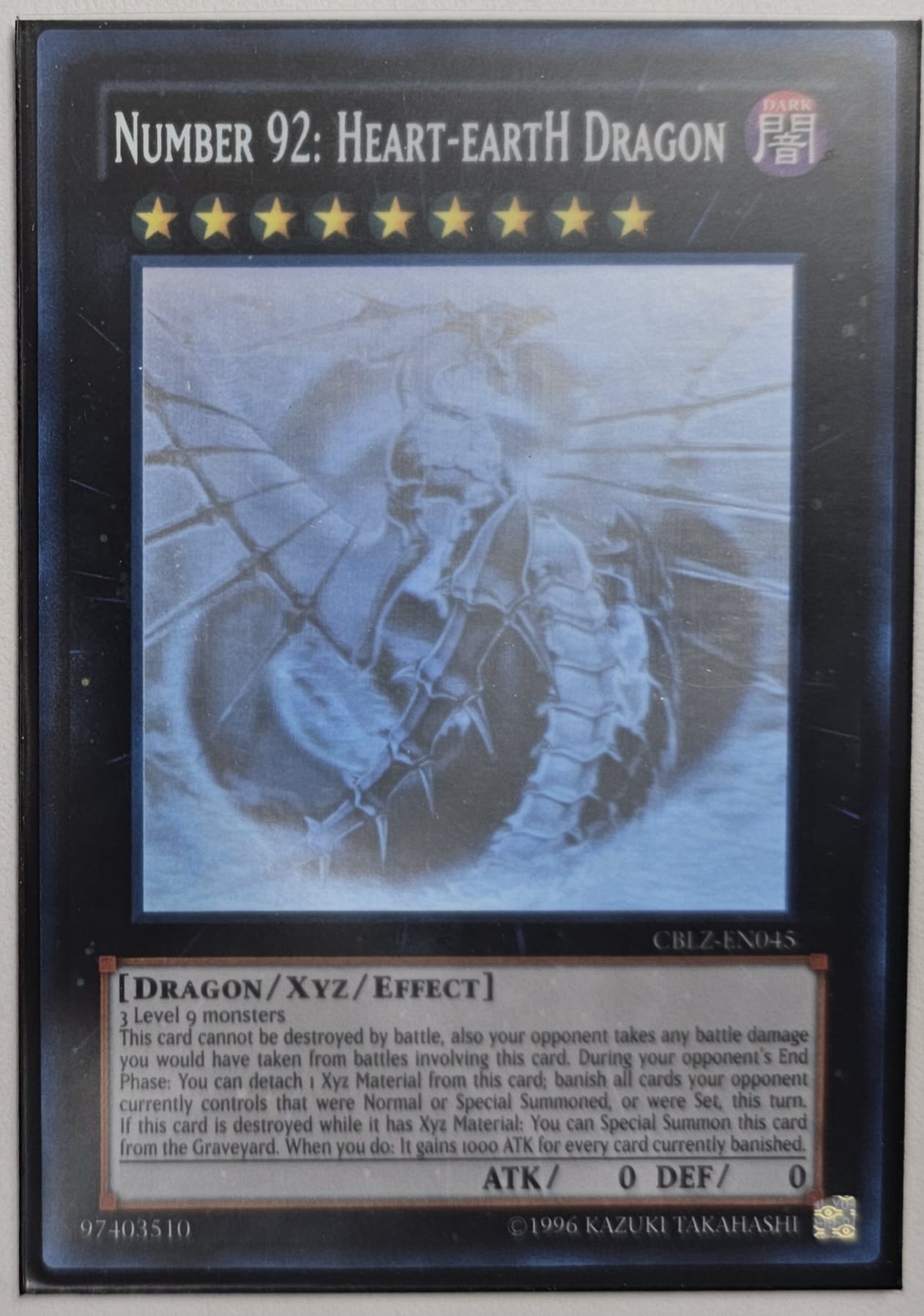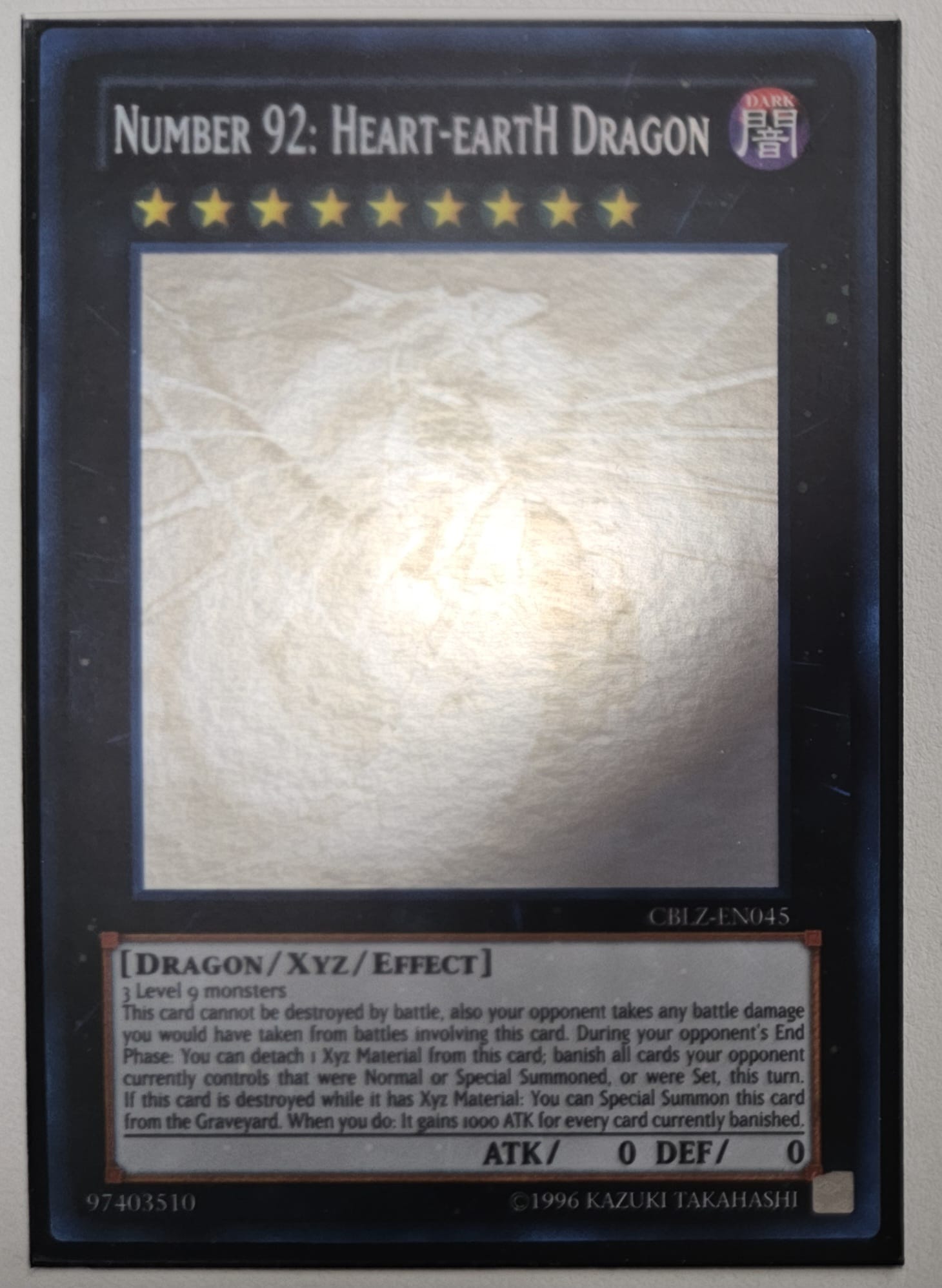 Non può essere distrutto in battaglia, inoltre il tuo avversario subisce qualsiasi danno da combattimento che avresti subito tu da battaglie che coinvolgono questa carta. Una volta per turno, durante la End Phase del tuo avversario: puoi staccare 1 materiale da questa carta; bandisci tutte le carte attualmente controllate dal tuo avversario che sono state Evocate Normalmente o Specialmente o Posizionate in questo turno. Se questa carta viene distrutta e mandata al Cimitero mentre ha materiale: puoi Evocare Specialmente questa carta. Se viene Evocata in questo modo: essa guadagna 1000 ATK per ogni carta attualmente bandita.