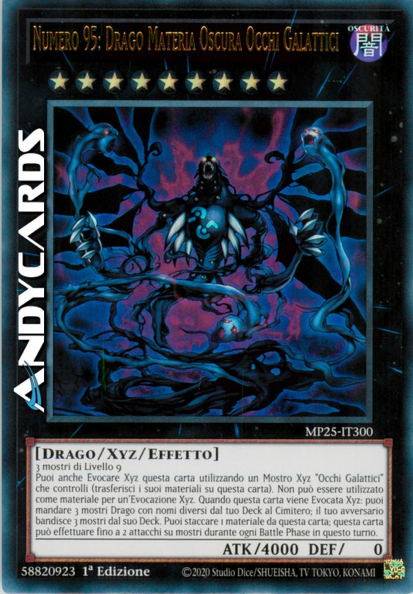 Puoi anch Evocare Xyz questa carta utilizzando un Mostro Xyz "Occhi Galattici" o "Galattico Occhi" che controlli come Materiale Xyz. (I Materiali Xyz attaccati a quel mostro diventano Materiali Xyz anche su questa carta). Non può essere utilizzato come Materiale Xyz per un'Evocazione Xyz. Quando questa carta viene Evocata Xyz: puoi mandare 3 mostri di Tipo Drago con nomi diversi dal tuo Deck al Cimitero; il tuo avversario bandisce 3 mostri dal suo Deck. Puoi Staccare 1 Materiale Xyz da questa carta; questa carta può effettuare fino a 2 attacchi su mostri durante ogni Battle Phase in questo turno.