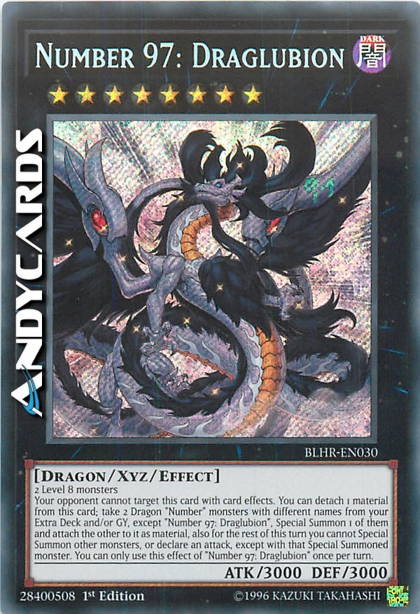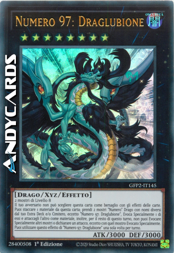 Il tuo avversario non può scegliere questa carta come bersaglio con gli effetti delle carte. Puoi staccare 1 materiale da questa carta; prendi 2 mostri "Numero" Drago con nomi diversi dal tuo Extra Deck e/o Cimitero, eccetto "Numero 97: Draglubione", Evoca Specialmente 1 di essi e attaccagli l'altro come materiale, inoltre, per il resto di questo turno, non puoi Evocare Specialmente altri mostri o dichiarare un attacco, eccetto con quel mostro Evocato Specialmente. Puoi utilizzare questo effetto di "Numero 97: Draglubione" una sola volta per turno.