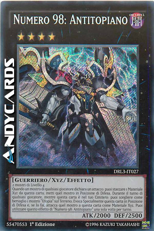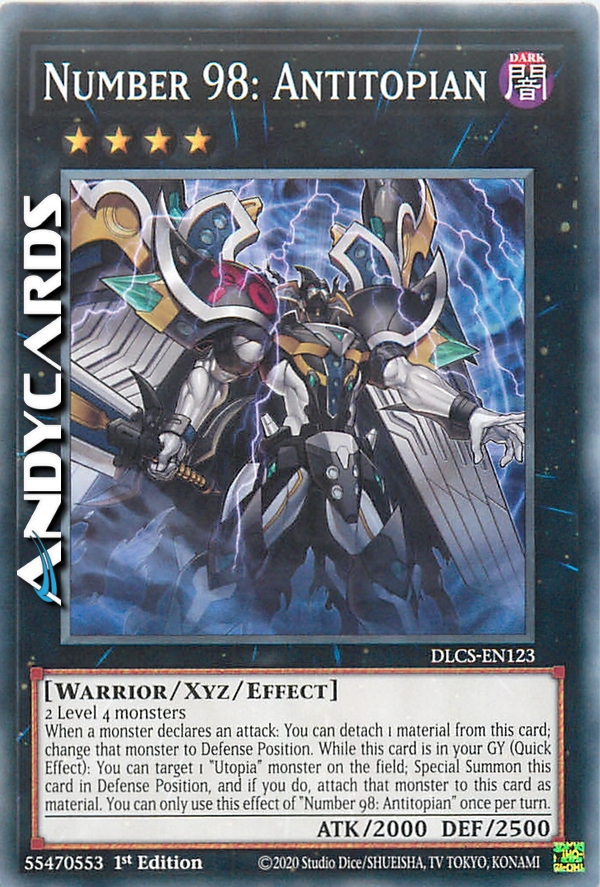 Quando un mostro di qualsiasi giocatore dichiara un attacco: puoi staccare 1 Materiale Xyz da questa carta; metti quel mostro in Posizione di Difesa. Durante il turno di qualsiasi giocatore, mentre questa carta è nel tuo Cimitero: puoi scegliere come bersaglio 1 mostro "Utopia" sul Terreno; Evoca Specialmente questa carta in Posizione di Difesa e, se lo fai, attacca quel mostro a questa carta come Materiale Xyz. Puoi utilizzare questo effetto di "Numero 98: Antitopiano" una sola volta per turno.