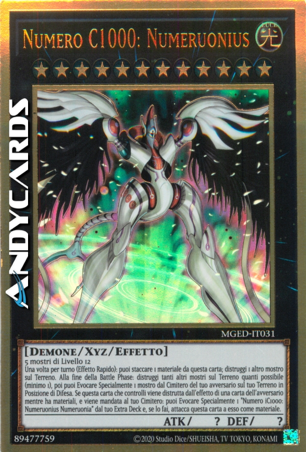 Una volta per turno (Effetto Rapido): puoi staccare 1 materiale da questa carta; distruggi 1 altro mostro sul Terreno. Alla fine della Battle Phase: distruggi tanti altri mostri sul Terreno quanti possibile (minimo 1), poi puoi Evocare Specialmente 1 mostro dal Cimitero del tuo avversario sul tuo Terreno in Posizione di Difesa. Se questa carta che controlli viene distrutta dall'effetto di una carta dell'avversario mentre ha materiali, e viene mandata al tuo Cimitero: puoi Evocare Specialmente 1 "Numero iC1000: Numeruonius Numeruonia" dal tuo Extra Deck e, se lo fai, attacca questa carta a esso come materiale.