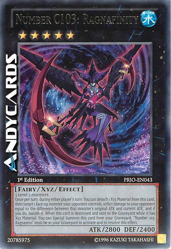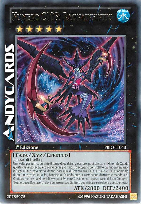 Una volta per turno durante il turno di qualsiasi giocatore : puoi staccare 1 materiale Xyz da questa carta, poi scegliere come bersaglio 1 mostro scoperto controllato dal tuo avversario infliggi al tuo avversario danno pari alla differenza di ATK attuale e l'ATK originale di quel mostro e, se lo fai, bandiscilo. Quando questa carta viene distrutta e mandata al Cimitero mentre ha Materiali Xyz: puoi Evocare Specialmente questa carta dal tuo Cimitero. "Numero 103: Ragnazero" deve essere nel tuo Cimitero per attivare e risolvere questo effetto.