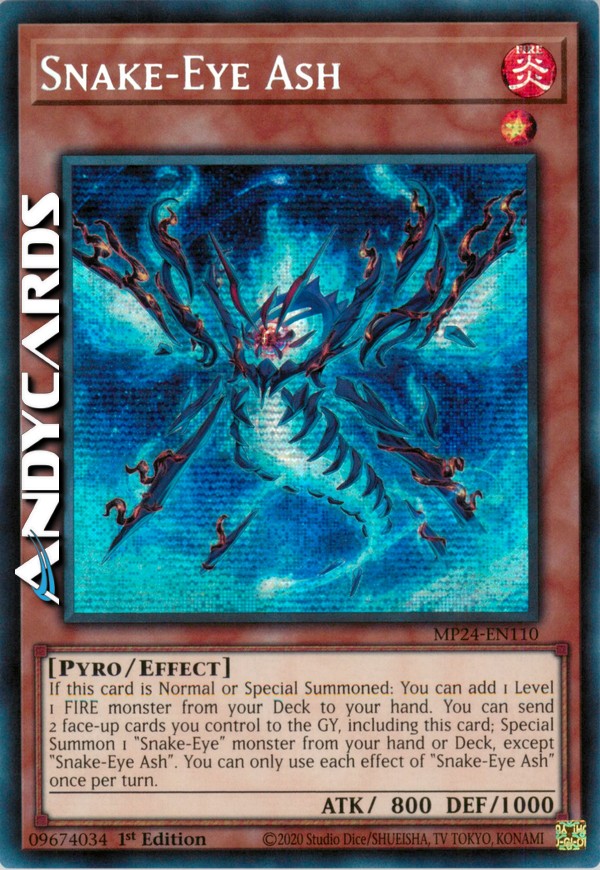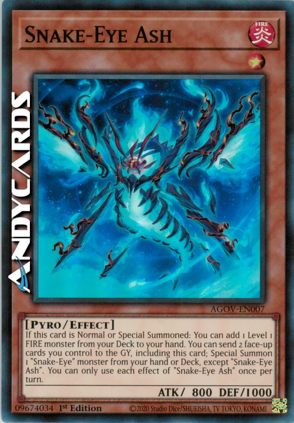 If this card is Normal or Special Summoned: You can add 1 Level 1 FIRE monster from your Deck to your hand. You can send 2 face-up cards you control to the GY, including this card; Special Summon 1 "Snake-Eye" monster from your hand or Deck, except "Snake-Eye Ash". You can only use each effect of "Snake-Eye Ash" once per turn.