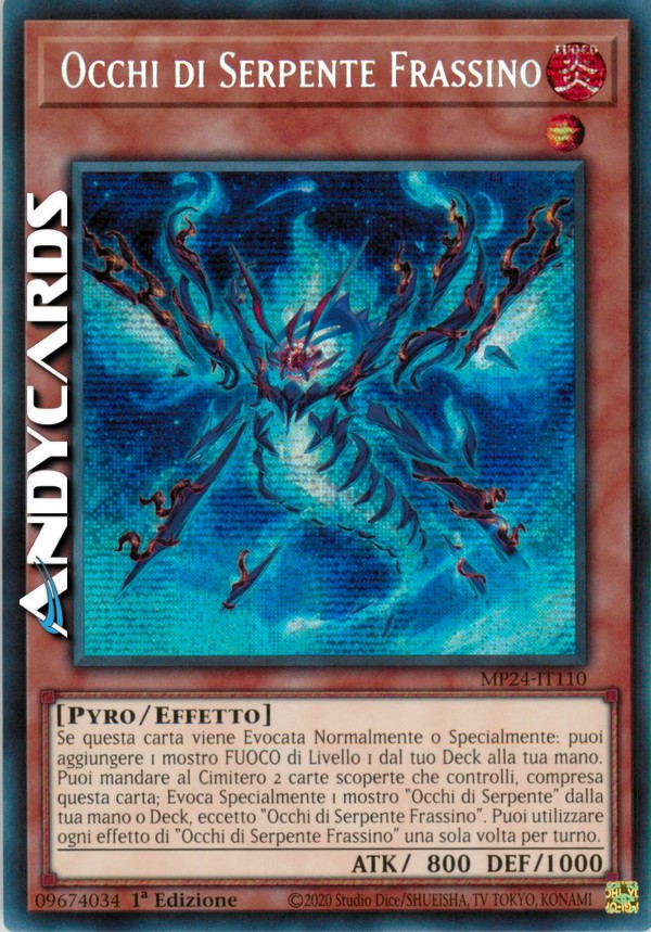 Se questa carta viene Evocata Normalmente o Specialmente: puoi aggiungere 1 mostro FUOCO di Livello 1 dal tuo Deck alla tua mano. Puoi mandare al Cimitero 2 carte scoperte che controlli, compresa questa carta; Evoca Specialmente 1 mostro "Occhi di Serpente" dalla tua mano o Deck, eccetto "Occhi di Serpente Frassino". Puoi utilizzare ogni effetto di "Occhi di Serpente Frassino" una sola volta per turno.