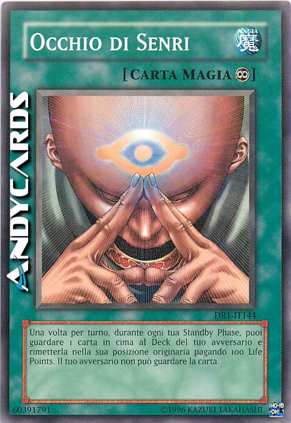 Una volta per turno, durante ogni tua Standby Phase, puoi guardare 1 carta in cima al Deck del tuo avversario e rimetterla nella sua posizione originaria pagando 100 Life Points. Il tuo avversario non può guardare la carta.
