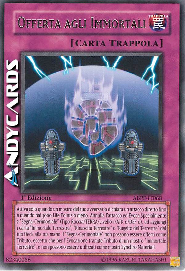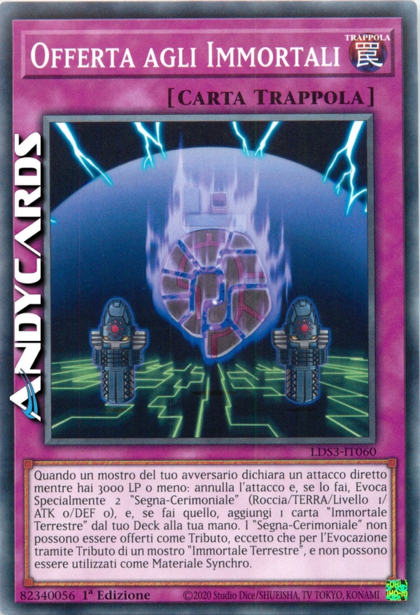 Quando un mostro del tuo avversario dichiara un attacco diretto mentre tu hai 3000 LP o meno: annulla l'attacco e, se lo fai, Evoca Specialmente 2 "Segna-Cerimoniale" (Tipo Roccia/TERRA/Livello 1/ATK 0/DEF 0), e, se fai quello, aggiungi 1 carta "Immortale Terrestre", "Rinascita Terrestre" o "Ruggito del Terrestre" dal tuo Deck alla tua mano. I "Segna-Cerimoniale" non possono essere offerti come Tributo, eccetto che per l'Evocazione tramite Tributo di un mostro "Immortale Terrestre", e non possono essere utilizzati come Materiali Synchro.