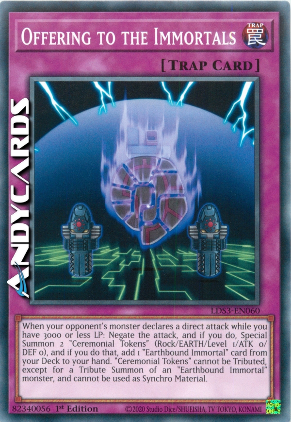 When your opponent's monster declares a direct attack while you have 3000 or less LP: Negate the attack, and if you do, Special Summon 2 "Ceremonial Tokens" (Rock-Type/EARTH/Level 1/ATK 0/DEF 0), and if you do that, add 1 "Earthbound Immortal" card, "Earthbound Revival", or "Roar of the Earthbound" from your Deck to your hand. "Ceremonial Tokens" cannot be Tributed, except for a Tribute Summon of an "Earthbound Immortal" monster, and cannot be used as Synchro Material.