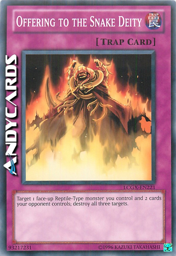 Scegli come bersaglio 1 mostro di Tipo Rettile scoperto che controlli e 2 carte controllate dal tuo avversario; distruggi tutti e tre i bersagli.